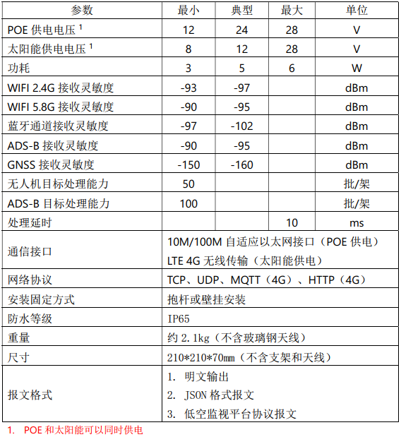 装置采用全铝合金外壳和玻璃钢天线,适应风吹、日晒、雨淋、雪冻等各种恶劣环境,支持抱杆和壁挂安装,支持以太网 POE 或者太阳能供电,可多设备连接到服务器组成大面积空域监视系统,可实时输出民航客机、通航飞机、无人机等各类飞行器的身份和位置信息以及 GNSS 信号强度、基站信号强度等信息。装置最远可监视 5km 范围内的无人机以及 250km 范围的通航飞机、民航客机,支持多种协议输出,支持可视化界面显示,提供上位机配置软件,支持网络远程配置,支持固件远程升级,提供软件定制和技术支持,方便使用和维护。